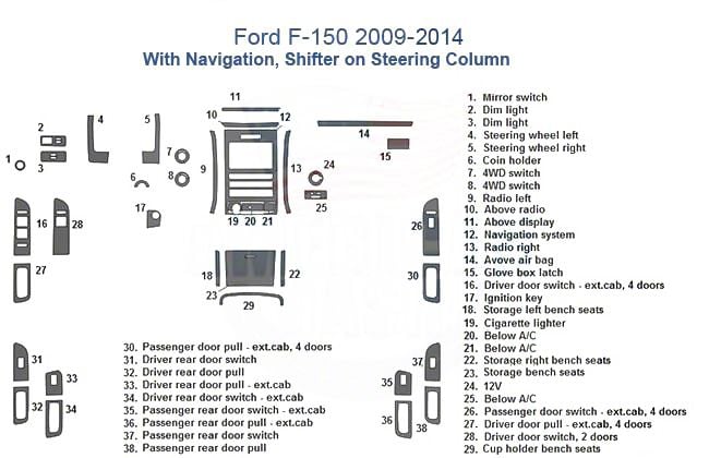 Application. The Full Dash Trim Kit; Carbon Fiber Finish fits 2009-2014 F-150 with Navigation and Steering Column Shifter.