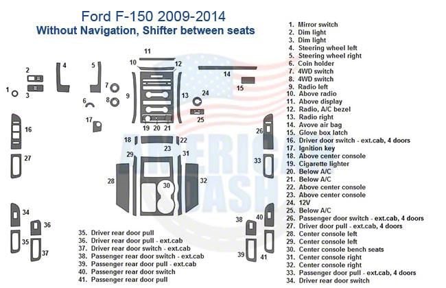 Application. The Full Dash Trim Kit; Carbon Fiber Finish fits 2009-2014 F-150 with Shifter Flow-Through Center Console and with no Navigation.