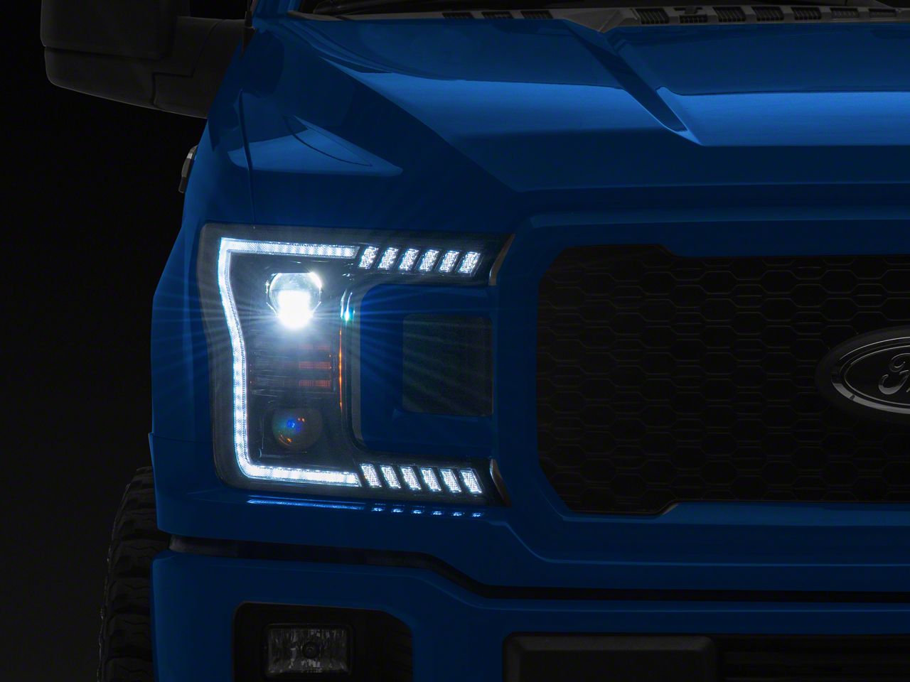 A Whole Lotta Light. These Full LED 2 Projector Headlights with White DRL Sequential Turn Signal; Black Housing; Clear Lens offer extraordinary illumination for your Ford F-150. With a sharp, focused beam of light from the projectors, safety is paramount and these headlights certainly let everyone know you are around.