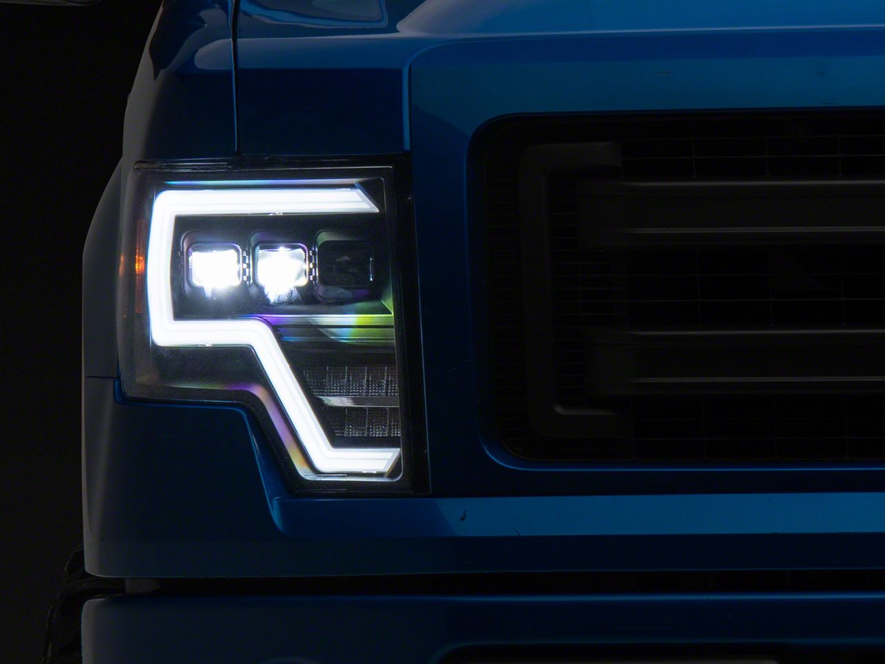 Modern Styling. Change up the appearance of your F-150 with a pair of Full LED DRL Projector Headlights; Black Housing; Clear Lens. With an impressive design, these Headlights flow nicely with the lines of your F-150's front end.