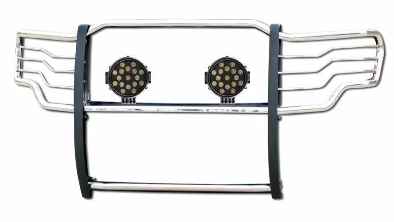 Grille Guard and Headlight Kit. Installing this Grille Guard with 7-Inch Round LED Lights; Polished on your Ford F-150 is an excellent way to add aggressive, off-road styling to your rig. Specifically designed to protect your headlights and grille from road and trail hazards, this Grille Guard is perfectly suited for F-150's that pull double duty on and off road.
