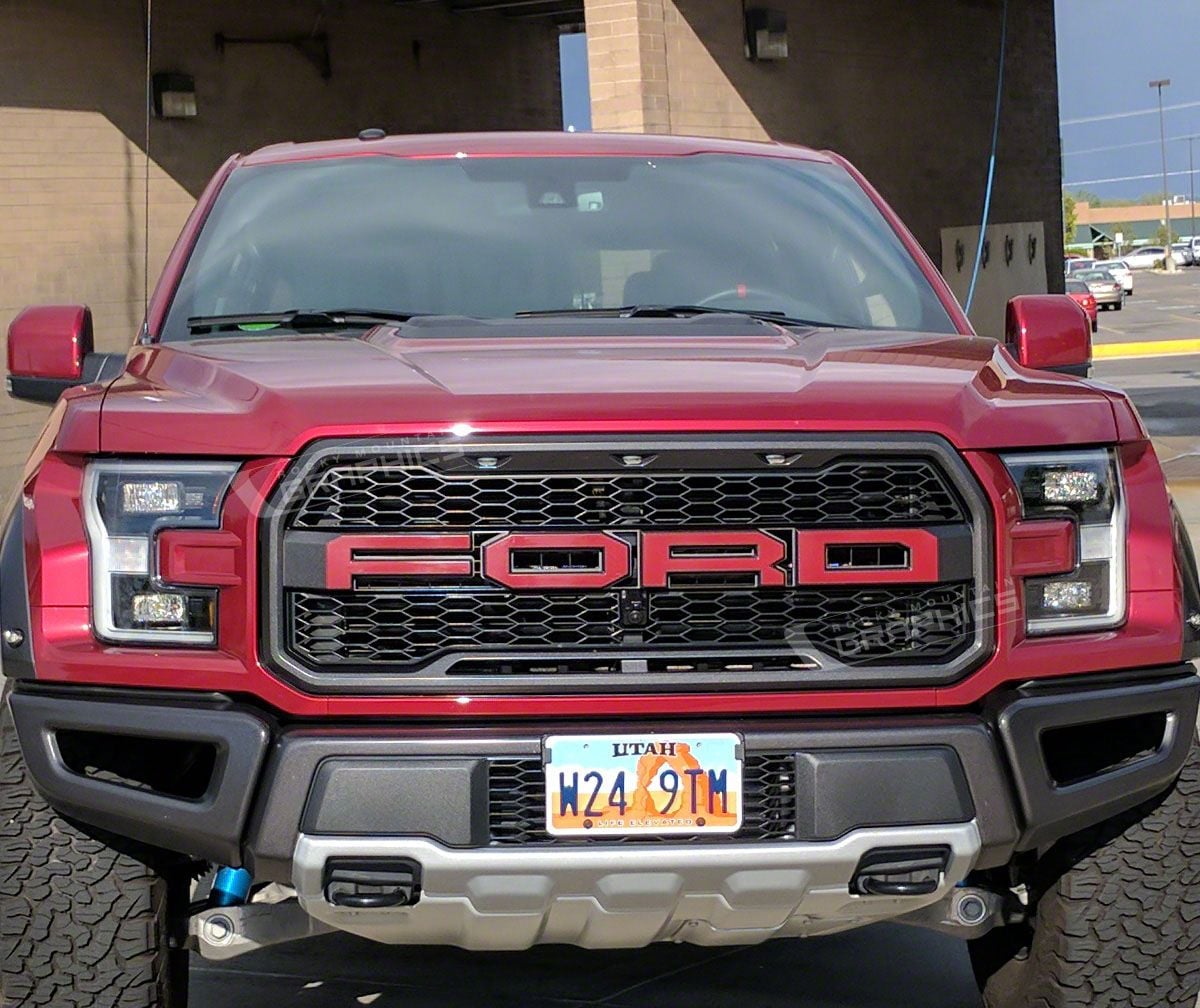 Application. The Grille Letter Decals; Red fits 2017-2020 F-150 Raptor models.