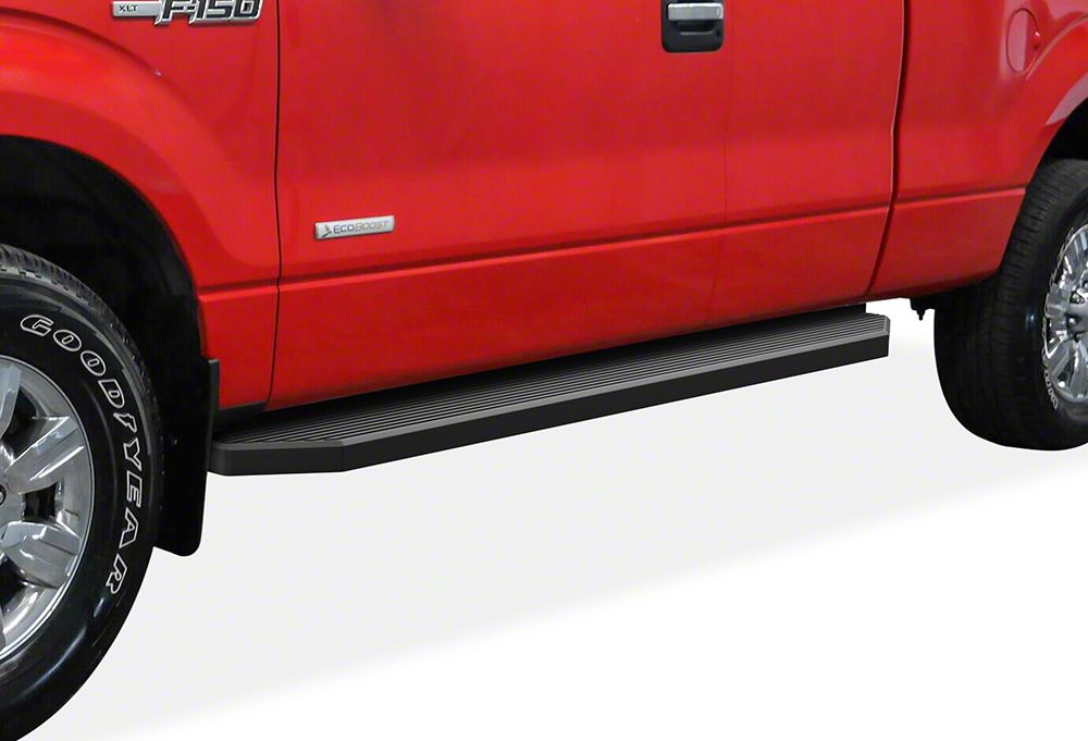 Improved Side Coverage. Step up to your F-150 and protect it from mess and scratches with this H-Style Running Boards; Black. Sporting a flat board design, this Step Ba offers 6-inches of additional coverage for your car's sides, blocking of mud, dust, dirt and rock from damaging your paint. It also makes for a safe step to get in and out of your car with greater ease.