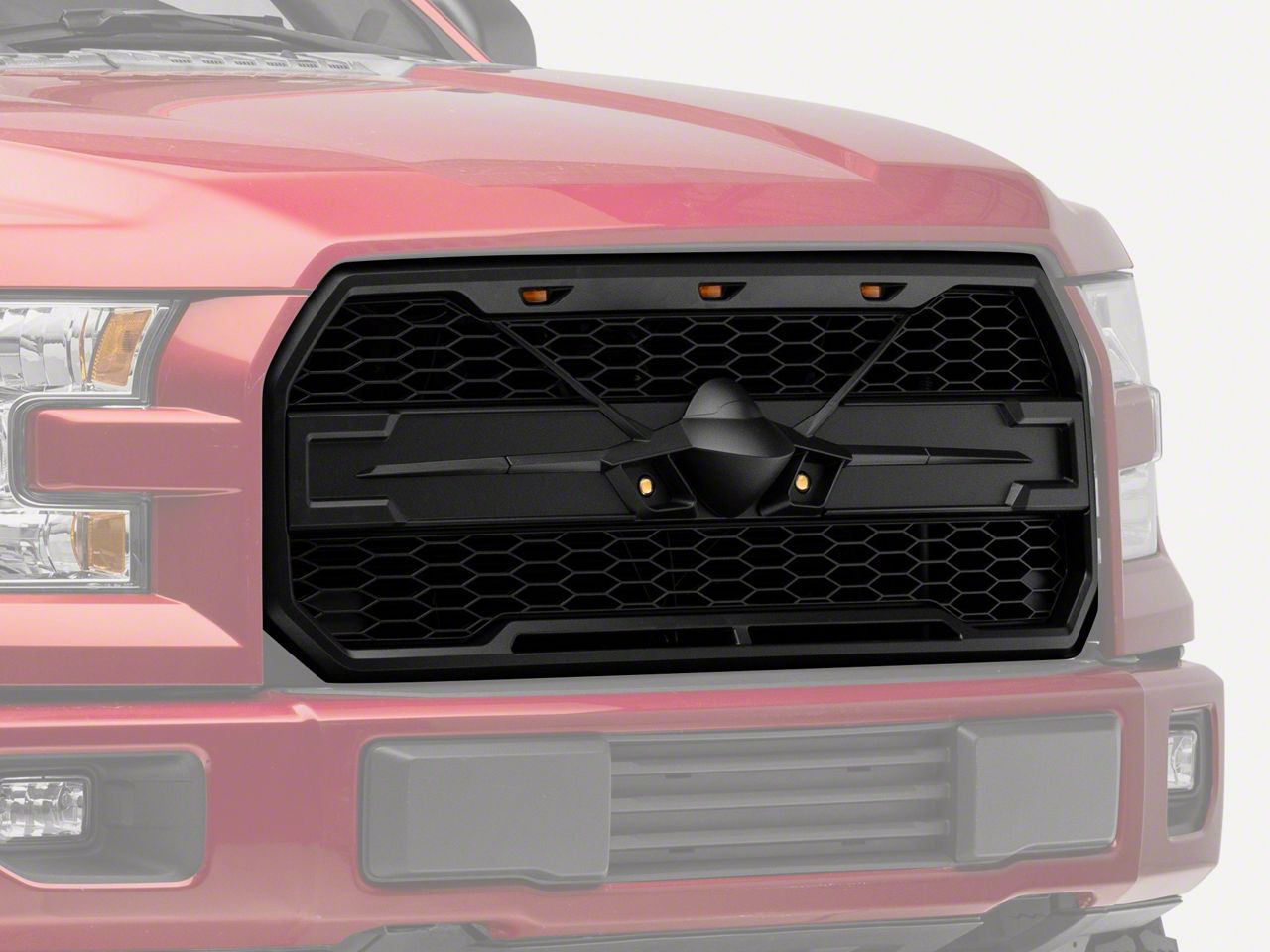 F-22 Raptor Styling. Add forceful styling to the front end of your 2015-2017 Ford F-150 with a RedRock Honeycomb Upper Replacement Grille. With a honeycomb style pattern, this Grille features the head on view of a F-22 Raptor Fighter Plane and includes three integrated LED accent lights across the top for high visibility. Designed to be installed in place of your factory grille, this Grille will transform the appearance of any 2015-2017 F-150.