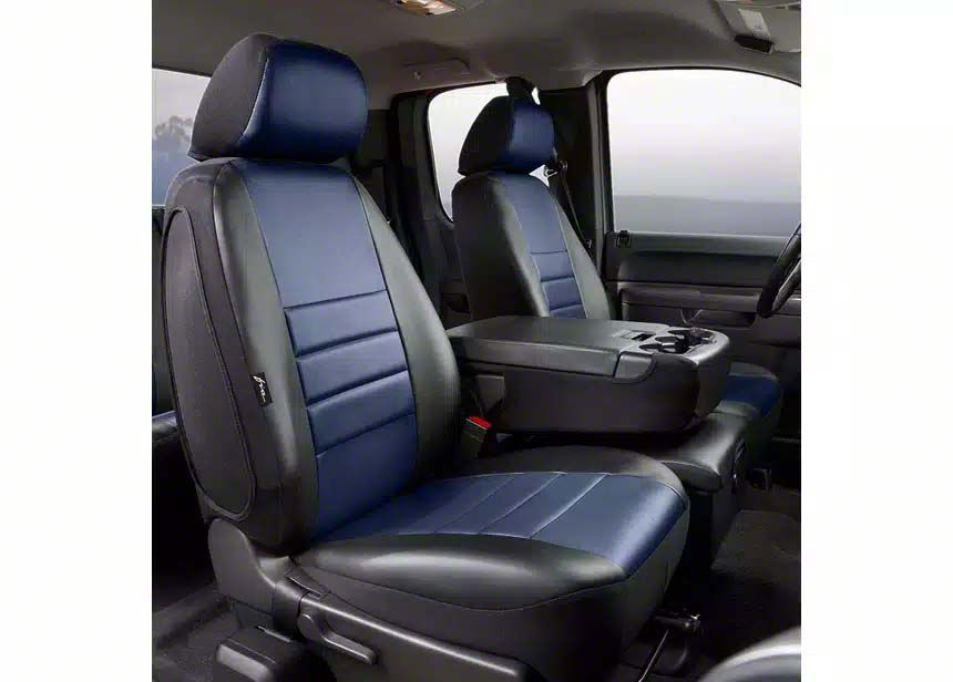 Construction and Appearance. Crafted from premium OE-grade leatherette material, the Fia LeatherLite Series covers are durable, UV and water-resistant, and come in an attractive Blue color. The soft-touch texture mimics real leather, delivering a luxurious upgrade to your vehicle’s interior.