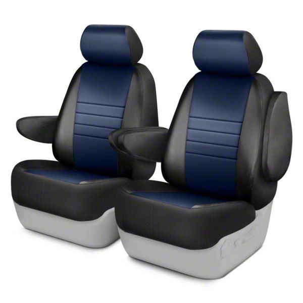 LeatherLite™ Series 1st Row Black & Blue Seat Covers (SL67-16 BLUE) by Fia®. 50/50 Buckets, with Adjustable Headrests, with Built-In Seat Belts. Soft touch simulated leather custom fit truck seat covers. Advanced design creates a dynamic state-of-the-art custom interior. Engineered to meet or exceed vehicle manufacturer standards.