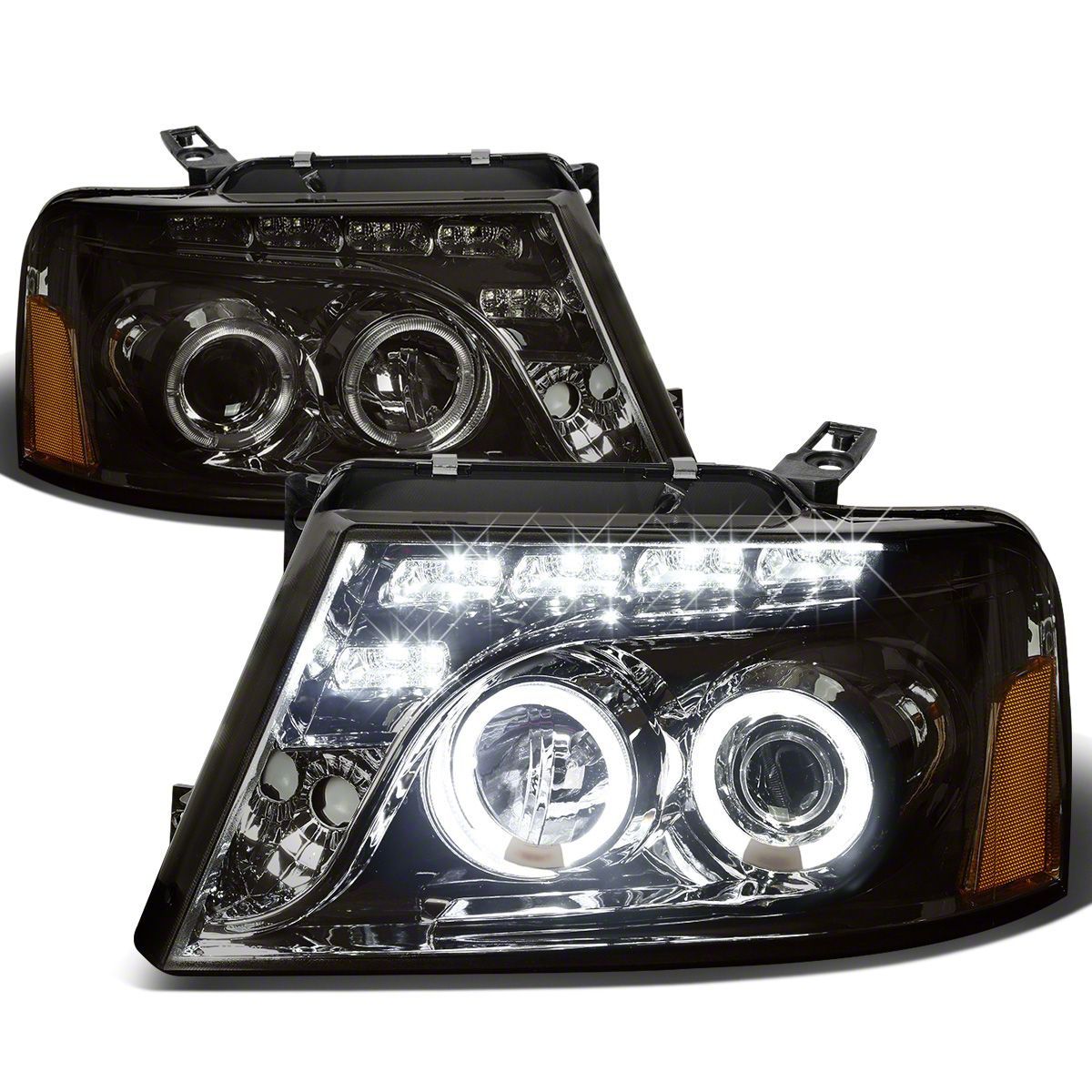 Application. This LED DRL Halo Projector Headlights with Amber Corners (Chrome Housing, Smoked Lens) fits 2004‑2008 Ford F‑150 models.