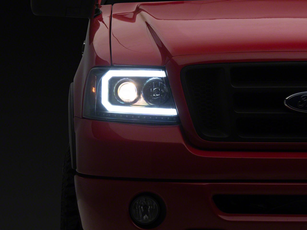 Application. This LED DRL Projector Headlights with Amber Corners, Black Housing, and Clear Lens fits all 2004-2008 Ford F-150 models.