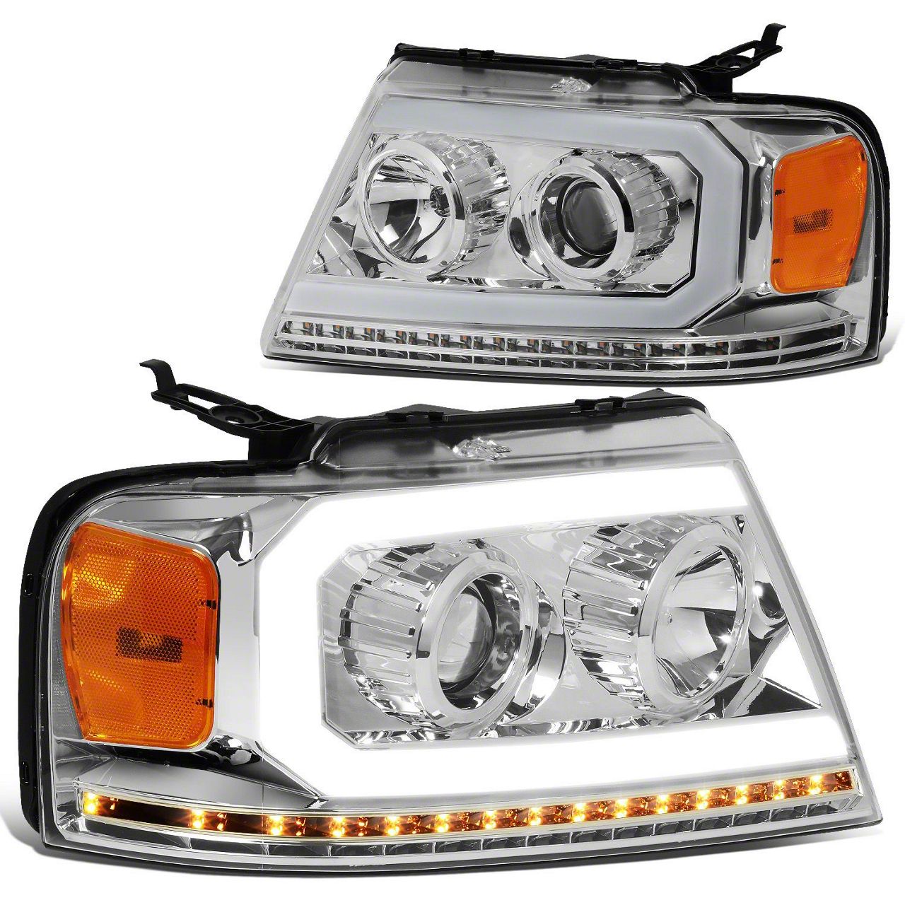 Application. The LED DRL Projector Headlights with Sequential Turn Signals and Amber Corners fit 2004-2008 F-150 models.