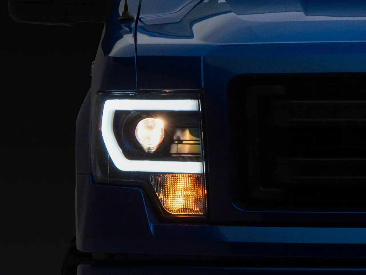 Modern Lighting Upgrade. The Light Bar DRL Projector Headlights are designed to provide both enhanced visibility and a stylish front-end upgrade for 2009-2014 Ford F-150 models with factory halogen headlights. These headlights feature built-in daytime running lights (DRL) that improve your vehicle's visibility while adding a modern, high-tech appearance.