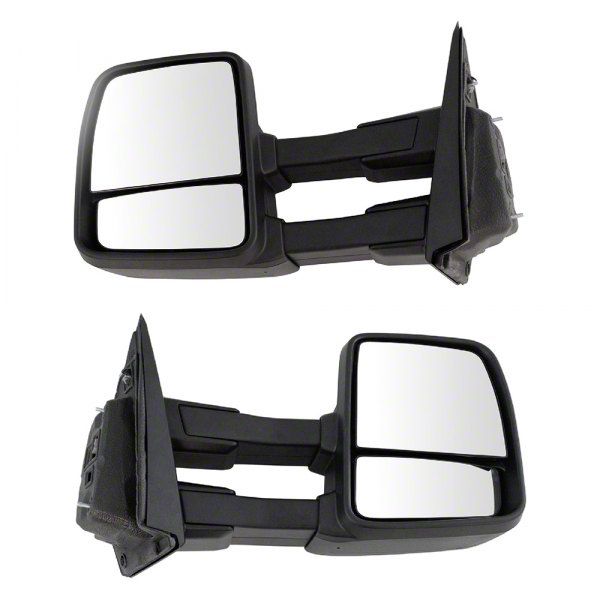Enhanced Towing Experience. Introducing our Manual Towing Mirrors in Textured Black. This pair of dual arm-style mirror assemblies are designed to enhance your towing experience. These mirrors provides added safety and visibility on the road. They are foldable and telescopic and their manual adjustment feature allows for precise positioning, ensuring optimal viewing angles.