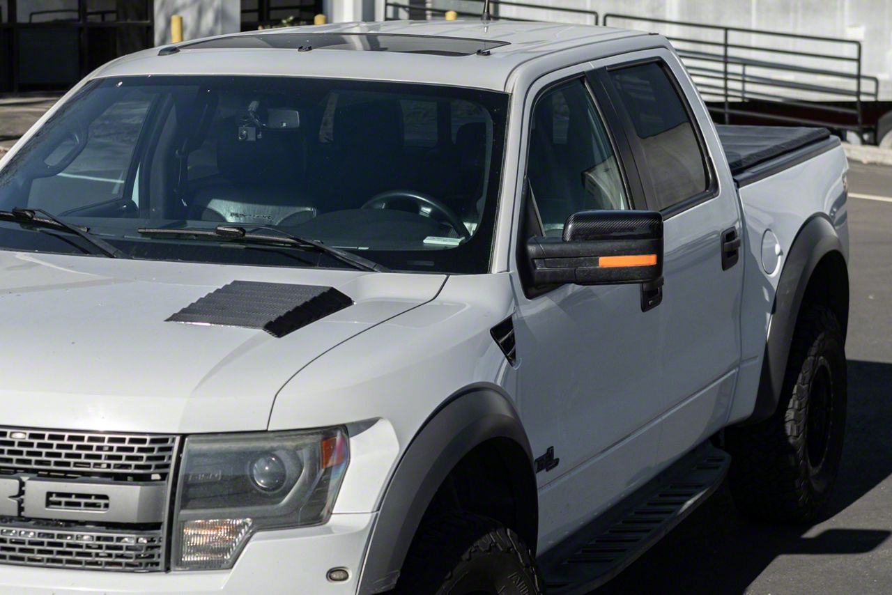 Carbon Fiber Mirror Covers. These Mirror Covers (Carbon Fiber) are designed to enhance the appearance of your Ford F-150 while protecting the factory mirrors. The covers easily snap on, offering a sleek and modern carbon fiber finish that adds style and performance appeal to your truck. They are an excellent choice for drivers who want both functionality and visual upgrade.