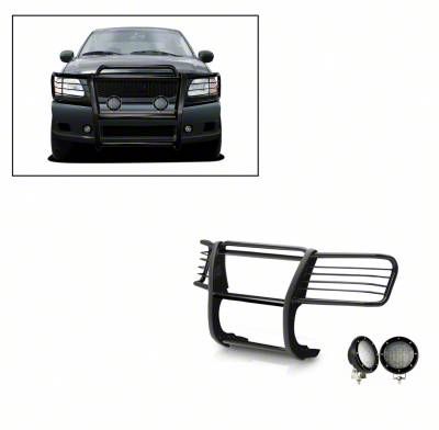 Illuminate the Night. Upgrade your nighttime driving experience with the Modular Grille Guard's integrated 5.30-inch black round flood LED lights. These powerful lights provide a wide beam of intense illumination, significantly improving visibility in low-light conditions. Whether you're navigating dark country roads or driving through foggy weather, these lights will help you see and be seen, reducing the risk of accidents.