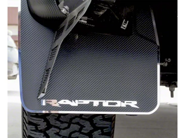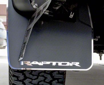 Construction and Appearance. Made from high-quality, lightweight carbon fiber, these mud flaps are both durable and stylish. The carbon fiber construction ensures long-lasting performance and resistance to wear, while the Raptor logo adds a custom touch to your vehicle's appearance.