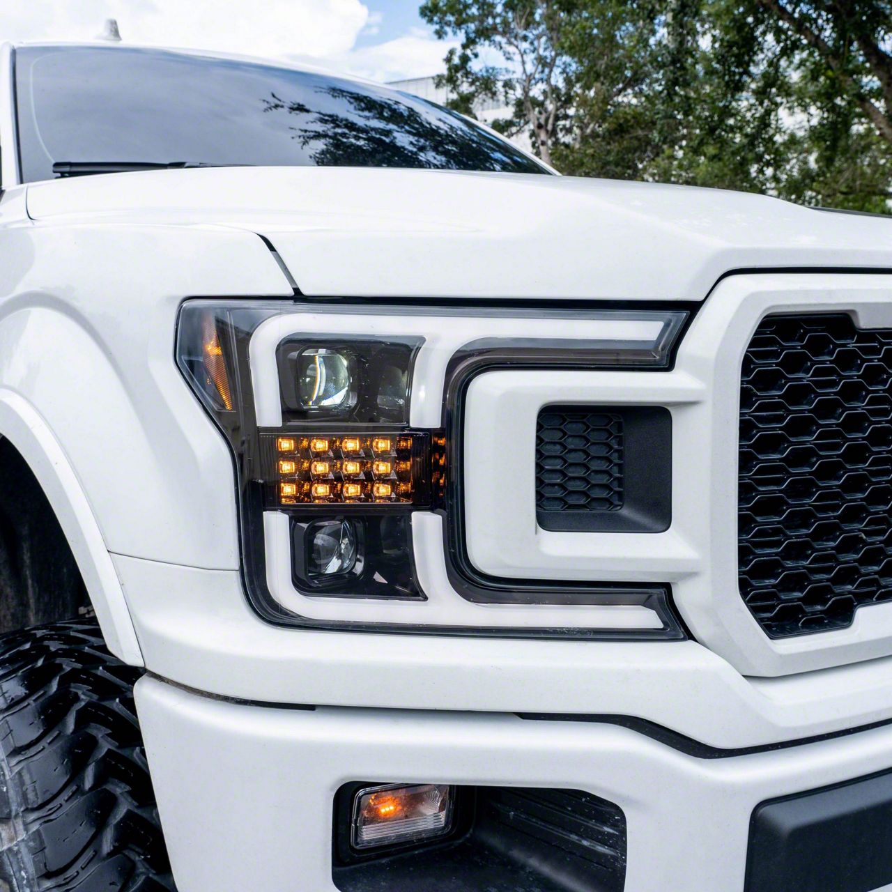 Application. These OLED DRL Projector Headlights with Switchback Turn Signals, Black Housing, and Smoked Lens fit all 2018 to 2020 Ford F-150 models with halogen headlights.