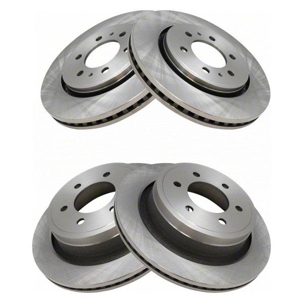 Premium Brake Rotor Set. The plain vented 6-lug front and rear rotors offer a reliable replacement solution designed to restore original braking performance. These rotors provide efficient heat dissipation and maintain consistent stopping power, ensuring vehicle safety and control during operation.