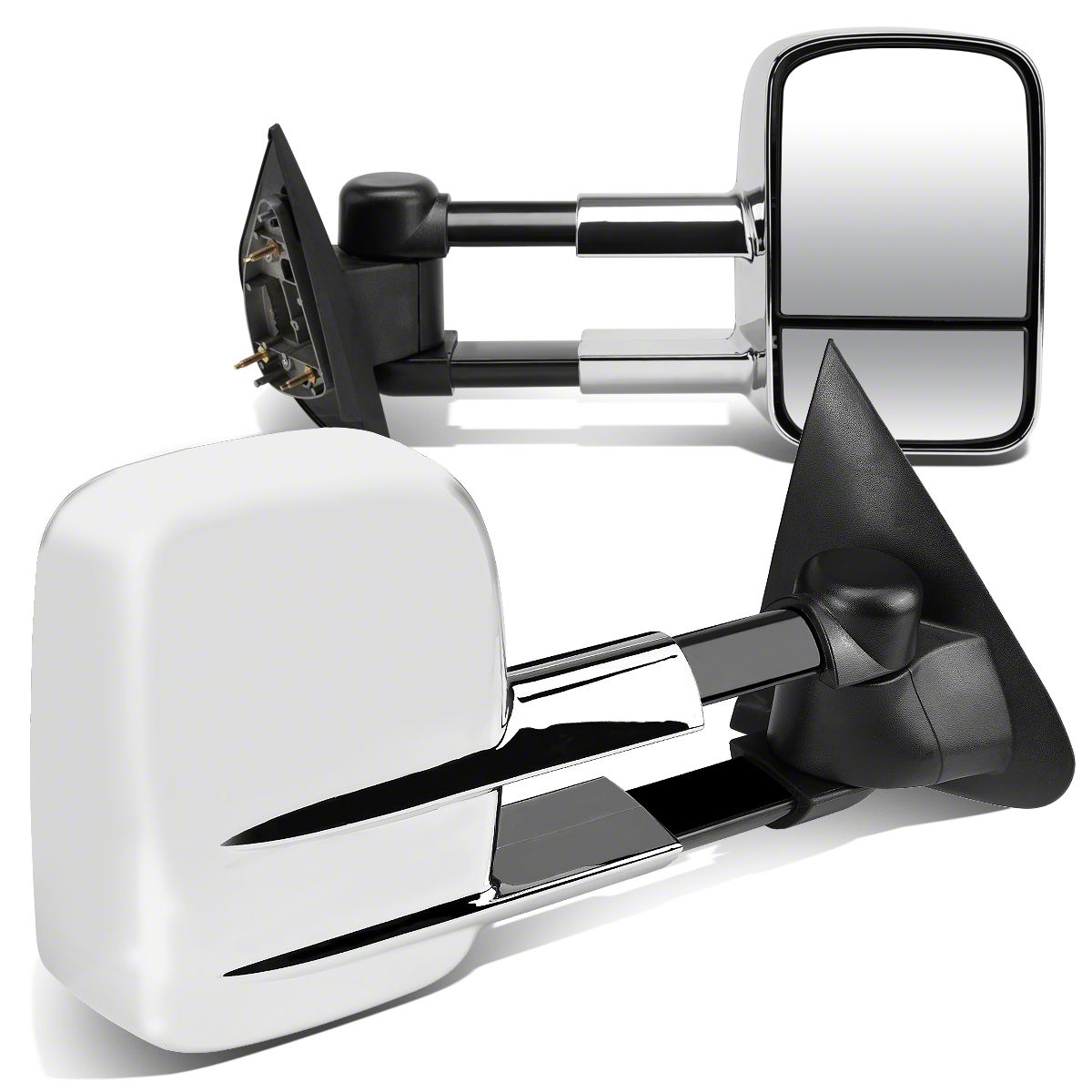 Enhanced Road Safety. Ensure your safety when towing by installing these Powered Towing Mirrors; Chrome on your Ford F-150. These side mirrors are built to safeguard the side and rear views even on foggy, rainy, or snowy weather conditions. They also feature telescopic style mirrors with convex spotter glasses for longer and wider viewing angles.