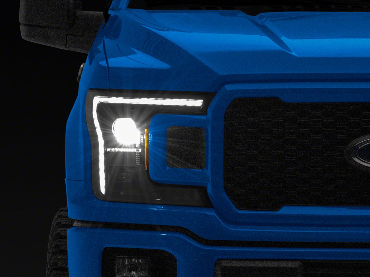 Premium Styling. These headlights feature a premium, modern design inspired by 14th generation F-150 pickups, including dual halogen projectors, a bright LED DRL light, signature claw LED turn signal, alpha black housing, and crisp, clear polycarbonate lens.