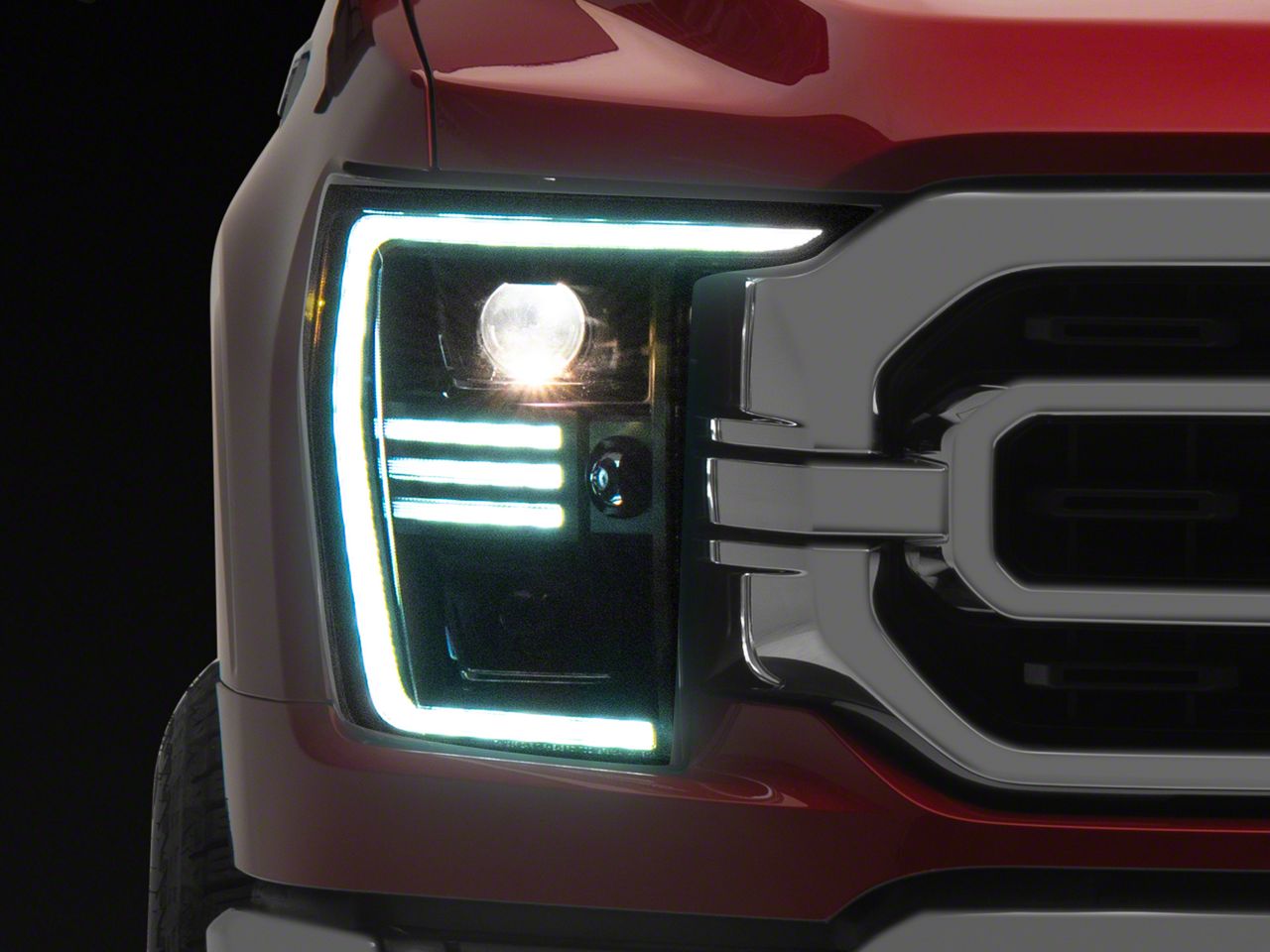 Illuminate in Style. Give your F-150 a bright upgrade with the PRO-Series Projector Headlights with Black Housing and Clear Lens. This pair of projector headlights features switchback white LED DRL lights and amber LED sequential signal lights. These lights also come with a turning assistant in the middle of each lamp that lights up the side when you are making a turn. This headlight upgrade guarantees excellent light output for better and more comfortable nighttime driving while remaining SAE/DOT-compliant.