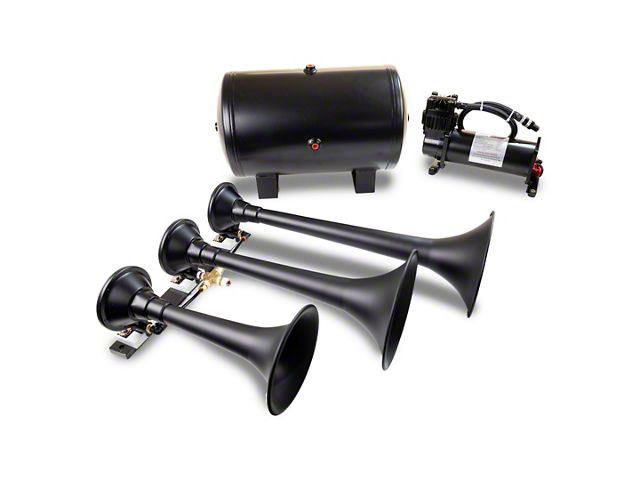 Exceptional Volume. Experience the thunderous roar of the ProBlaster Triple Train Horn System; Black - a powerhouse of sound that's sure to turn heads wherever you go. This kit features the Demon; Model 730, the biggest train horn kit available, designed to deliver exceptional volume and aggressiveness.