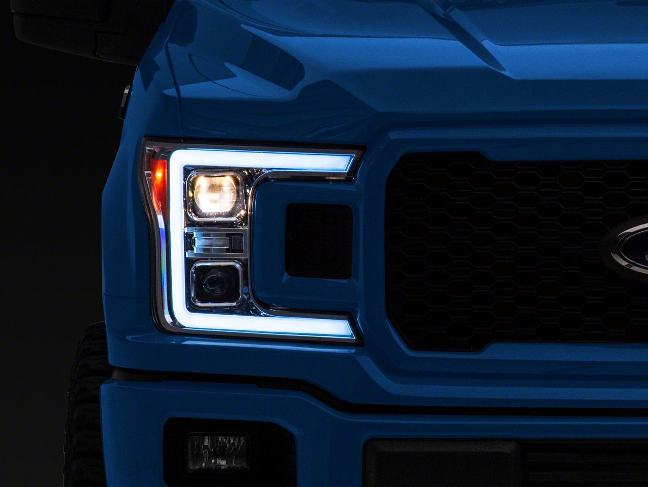 Application. These Projector Headlights with Sequential Turn Signals; Chrome Housing; Clear Lens are designed to fit 2018-2020 Ford F-150 models equipped with Halogen Headlights. Sold as a pair, driver and passenger side lights are included.