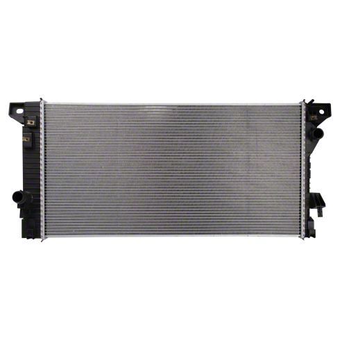Direct Replacement. Made for the Ford F-150 without a heavy-duty tow package, this Radiator comes in a matte black and raw aluminum finish. Fully leak-tested as a direct replacement for your broken, cracked, or leaking stock radiator, this part has an aluminum core width of 34.63 inches, a core height of 18.5 inches, and an outlet and inlet diameter of 1.5 inches.