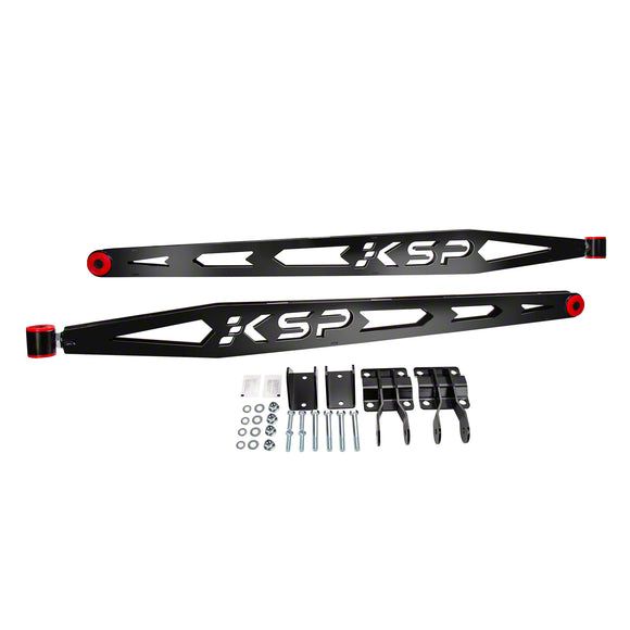 Construction and Appearance. Finished in matte black, these traction bars are constructed from high-strength steel and come equipped with greaseable, high-elasticity polyurethane bushings for long-lasting performance. With adjustable threaded ends, the bars range from 1,360mm to 1,440mm in length and can be customized with LED light strips or personalized paint for added flair.