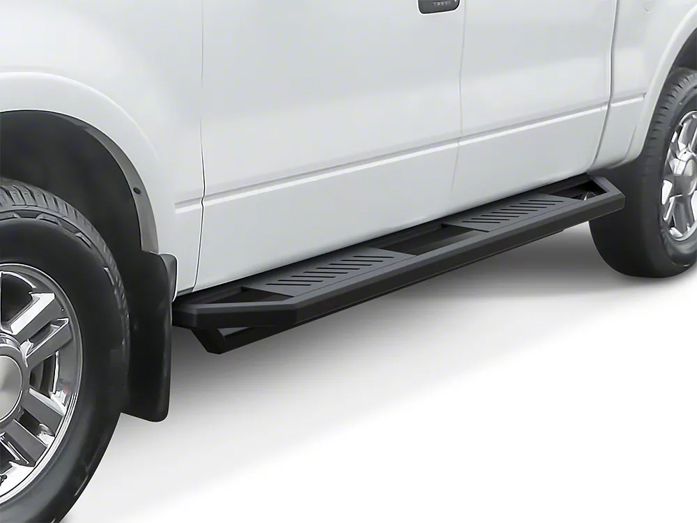 Aggressive Bold Styling. If you are looking for a way to access your F-150 without ruining its look, than this Rocker Armor Side Step Bars; Matte Black is for you. Expertly crafted, it offers a safe step while also complimenting the tough look of your vehicle with its strong aggressive geometry and thick matte black finish for a strong clean aesthetic.