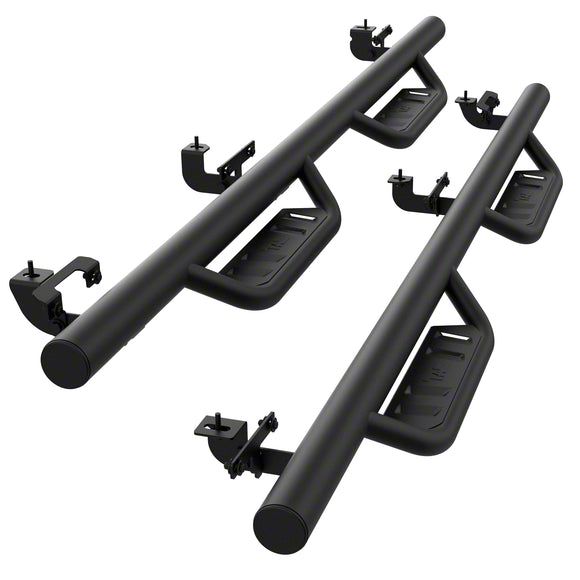 Construction and Features. These running boards feature a fixed step design with a load capacity of 330 pounds each, ensuring reliable support for passengers. The fine textured black finish is both rust-resistant and visually appealing, making these running boards a long-lasting upgrade. Designed to withstand tough conditions, they also shield your truck from bumps, hits, and other road debris.