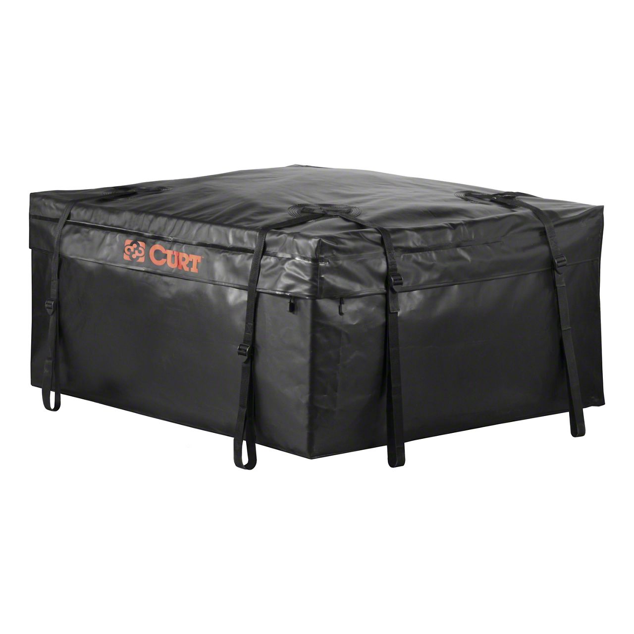 Construction and Appearance. This Extended Roof Rack Cargo Bag measures 38 x 34 x 18 inches and offers 13.50 cubic feet of storage. The bag is made from 500 x 500 denier, UV-resistant vinyl and features welded seams to be weather resistant. The bag is black and folds easily for storage.