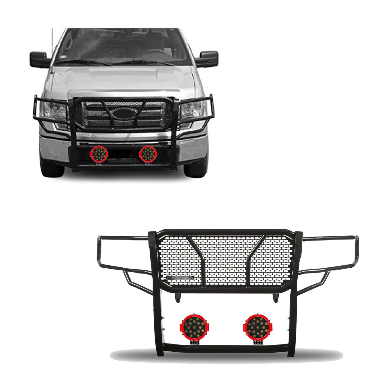 Application. The Rugged Heavy Duty Grille Guard with 7-Inch Red Round LED Lights fits 2009-2014 Ford F-150 Models (Excluding Raptor).