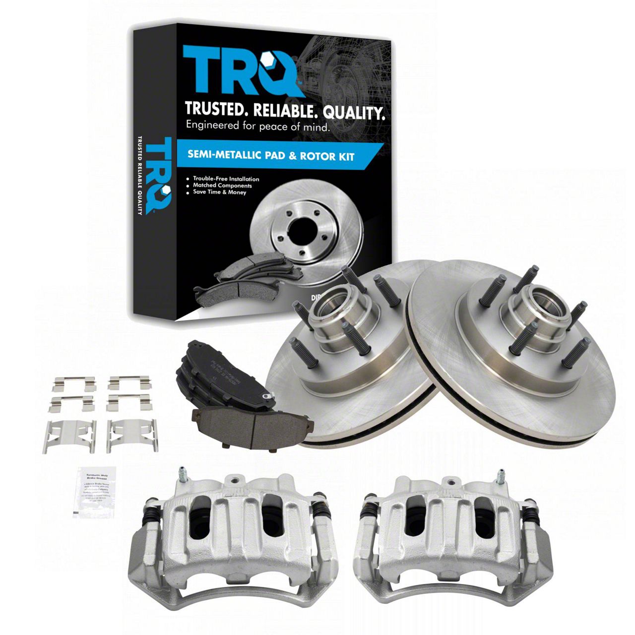 Complete Brake Solution. The Semi-Metallic 5-Lug Brake Rotor, Pad and Caliper Kit; Front provides a full front brake system upgrade. Designed to restore braking performance by replacing rotors, pads, and calipers, this kit ensures reliable stopping power and vehicle safety. It's essential for maintaining effective brake function and extending service life.