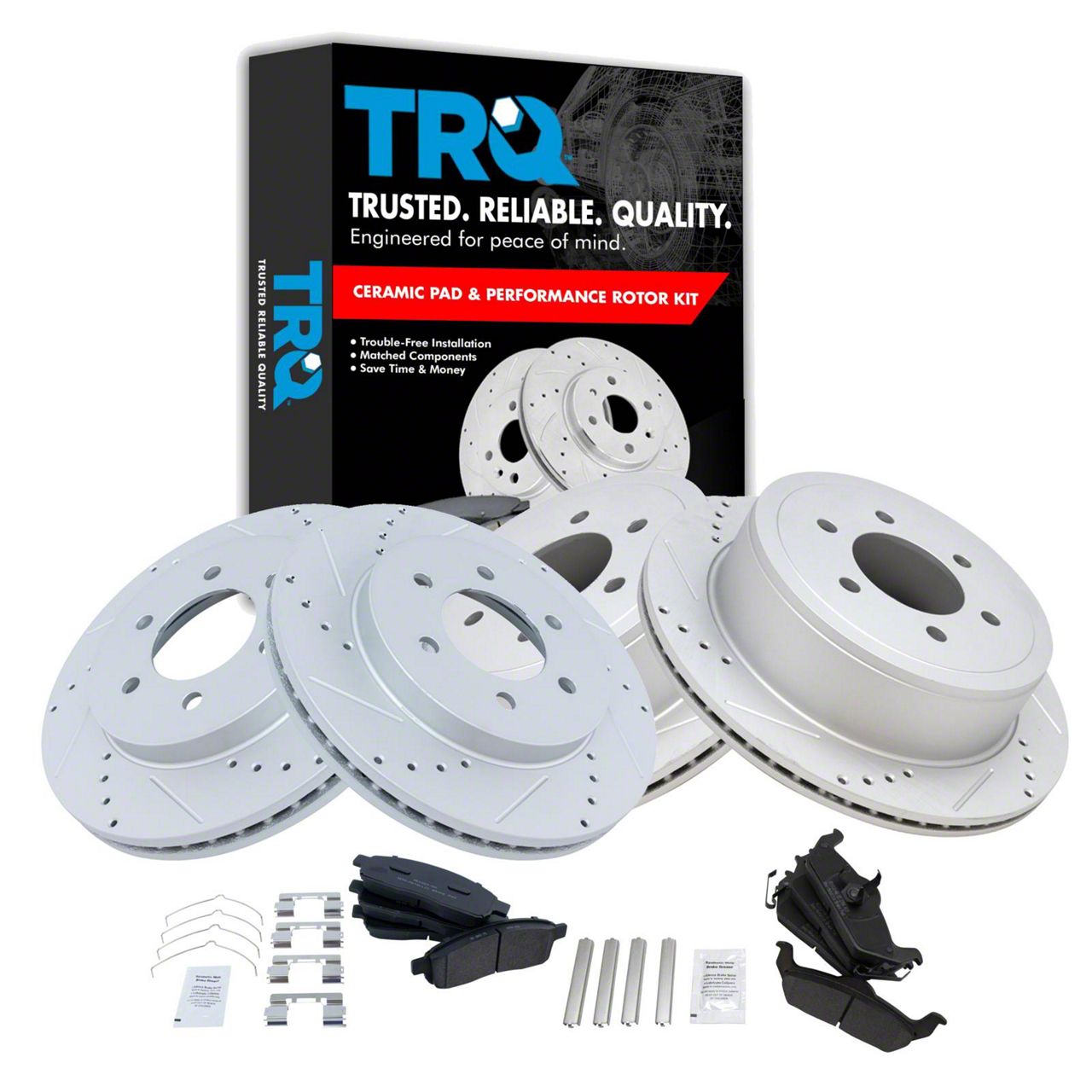 TRQ brake kits are designed to restore your brake system to like-new performance. TRQ brake pads are positive molded, thermal scorched, chamfered, and utilize a multi-layer shim for enhanced performance and service life. TRQ G-coated rotors have long-lasting rust prevention, perfect for wheels with large openings that expose the rotor and rotor hat during daily drives. All products are fit and road-tested in our Massachusetts Rand;D facility to ensure we deliver on our promise of Trusted Reliable Quality.