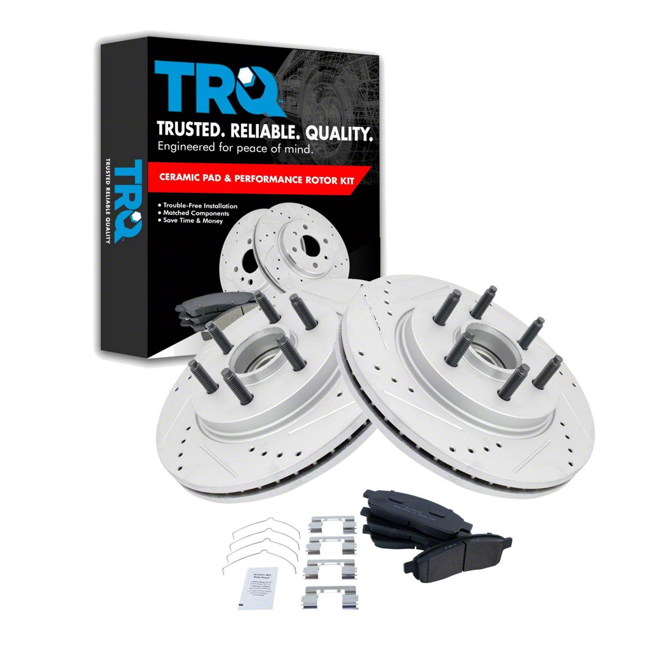 TRQ brake kits are designed to restore your brake system to like-new performance. TRQ brake pads are positive molded, thermal scorched, chamfered, and utilize a multi-layer shim for enhanced performance and service life. TRQ G-coated rotors have long-lasting rust prevention, perfect for wheels with large openings that expose the rotor and rotor hat during daily drives. All products are fit and road-tested in our Massachusetts Rand;D facility to ensure we deliver on our promise of Trusted Reliable Quality.