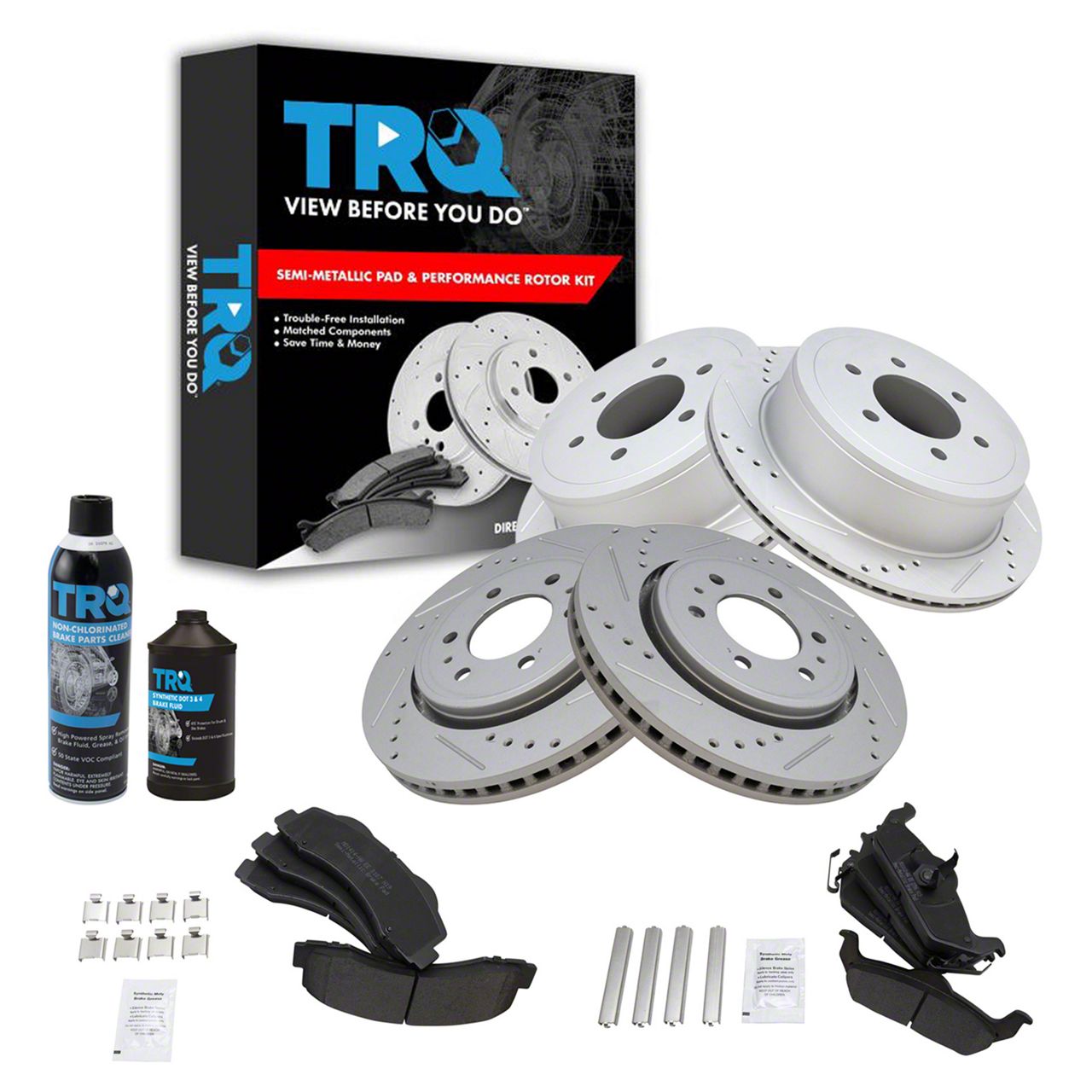 TRQ brake kits are designed to restore your brake system to like-new performance. TRQ brake pads are positive molded, thermal scorched, chamfered, and utilize a multi-layer shim for enhanced performance and service life. TRQ G-coated rotors have long-lasting rust prevention, perfect for wheels with large openings that expose the rotor and rotor hat during daily drives. All products are fit and road-tested in our Massachusetts Rand;D facility to ensure we deliver on our promise of Trusted Reliable Quality.