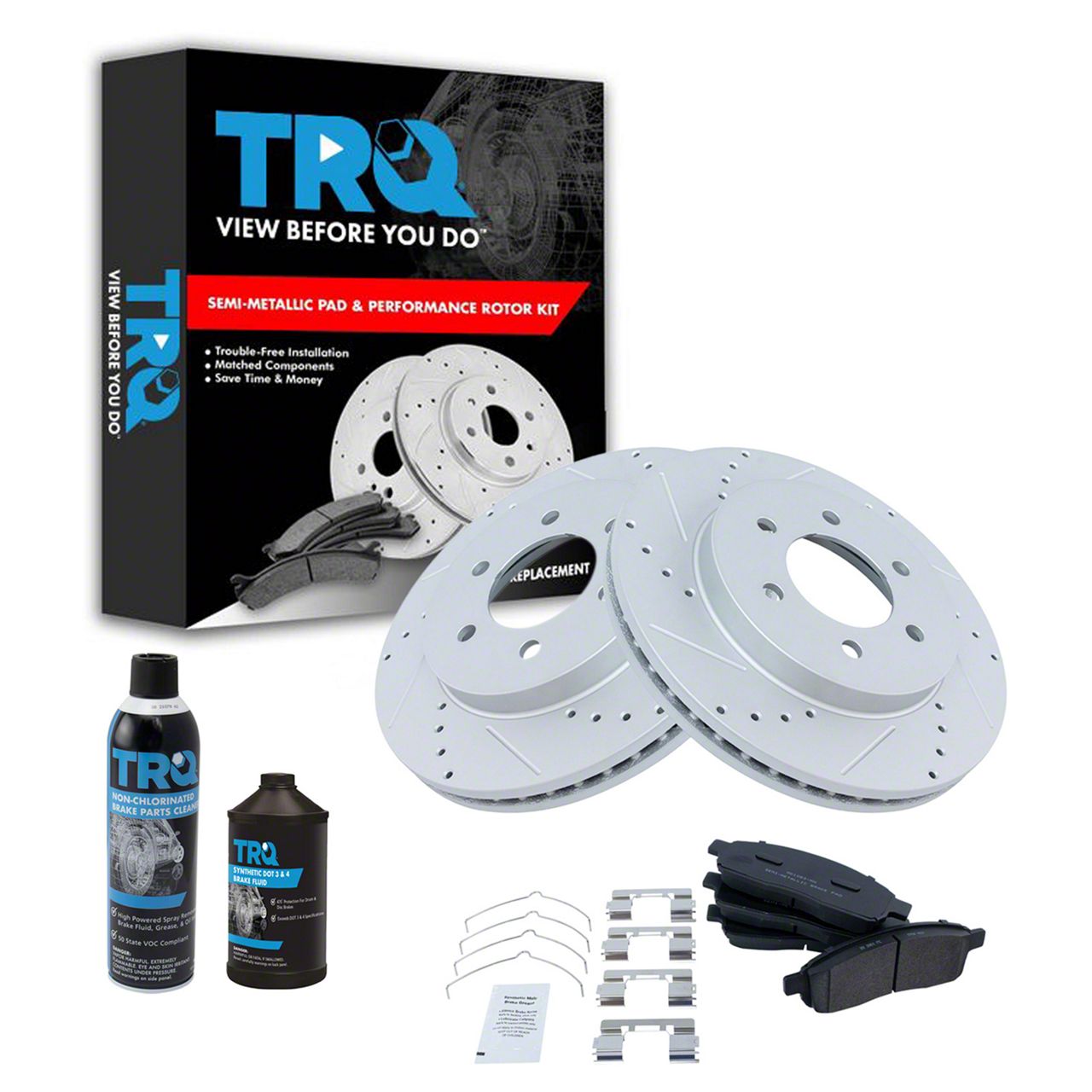 TRQ brake kits are designed to restore your brake system to like-new performance. TRQ brake pads are positive molded, thermal scorched, chamfered, and utilize a multi-layer shim for enhanced performance and service life. TRQ G-coated rotors have long-lasting rust prevention, perfect for wheels with large openings that expose the rotor and rotor hat during daily drives. All products are fit and road-tested in our Massachusetts Rand;D facility to ensure we deliver on our promise of Trusted Reliable Quality.