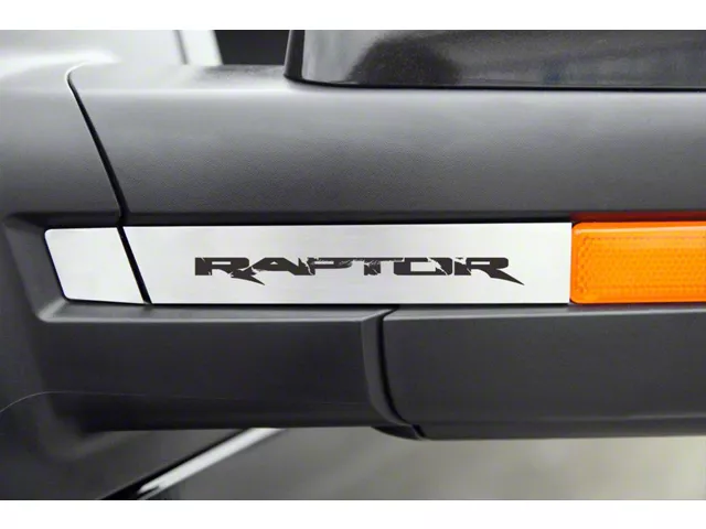 Premium Construction. The side view mirror accent plates from American Car Craft are made from high-quality stainless steel and feature a brushed finish. The word "Raptor" is etched professionally and with laser precision. The plates are resistant to rust fading and won't tarnish.