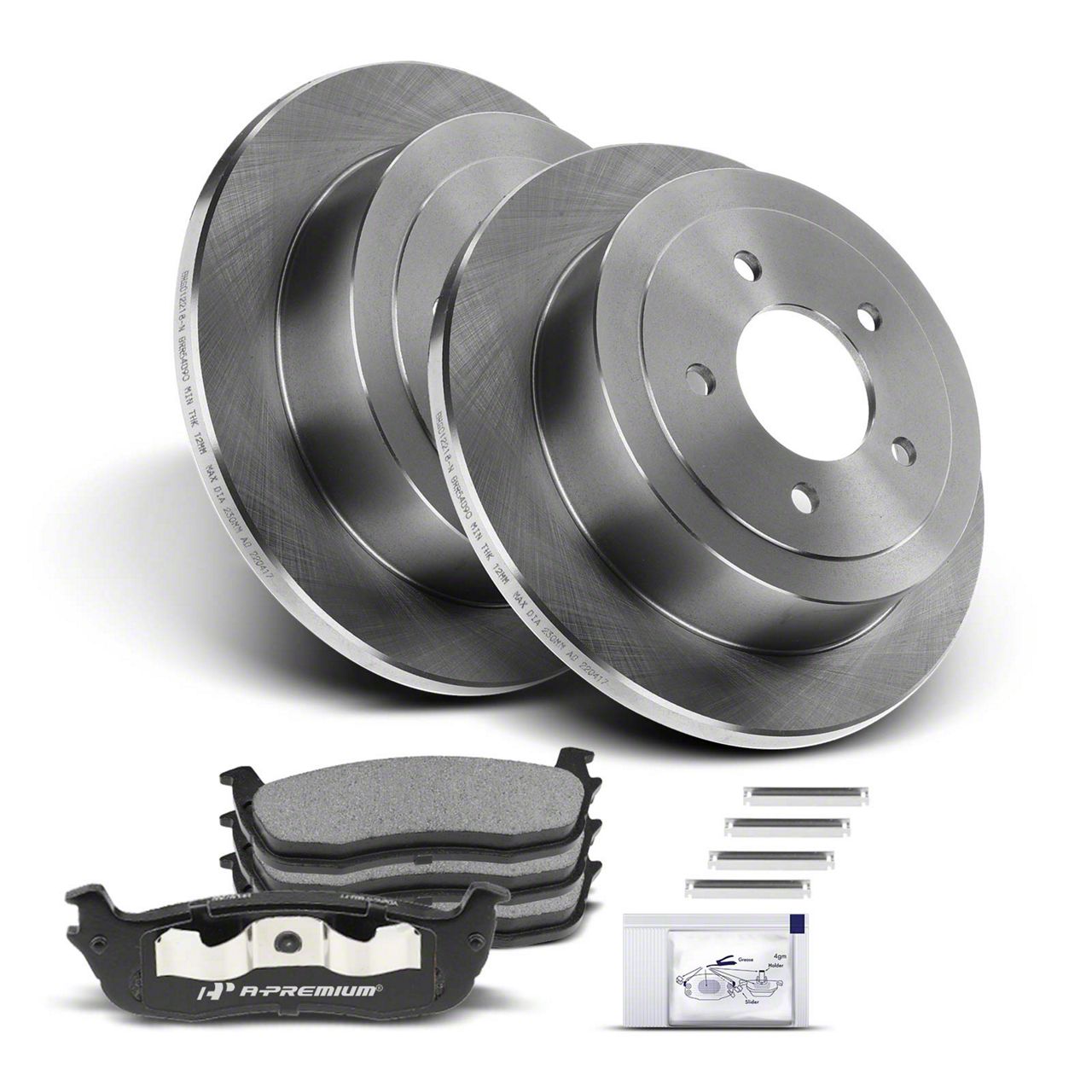 Construction and Appearance. Crafted from durable cast iron, the solid rotors offer strength and effective heat dissipation. The ceramic brake pads feature excellent friction characteristics with reduced wear, backed by iron backing plates for stability. These components prioritize performance and durability.