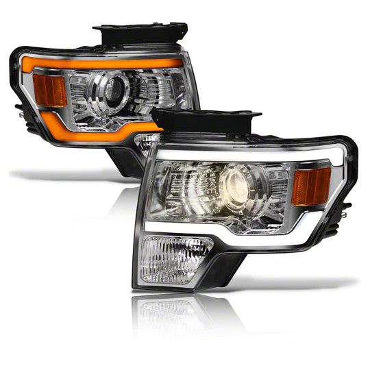 Application. The SQP Series Headlights with Sequential Turn Signals; Chrome Housing; Clear Lens fits 2009-2014 F-150 with Factory Halogen Headlights.