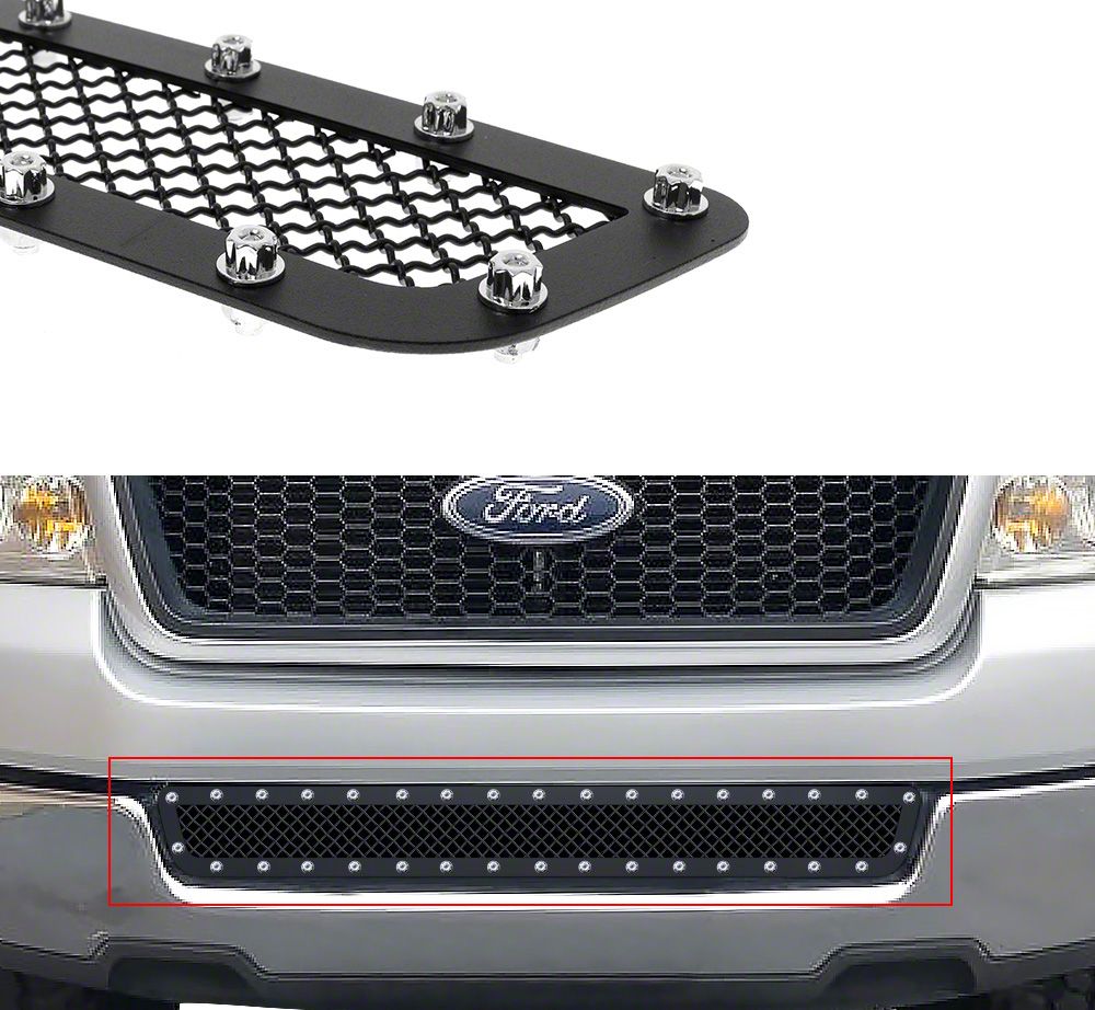 Aggressive Styling. A Stainless Steel Rivet Lower Grille Insert is an excellent way to add a more aggressive appearance to your F-150. With a mesh grille design and accent rivets, this black Grille Insert will set your personal F-150 apart from all the rest. This Grille is an insert that simply attaches over your F-150's stock lower grille.