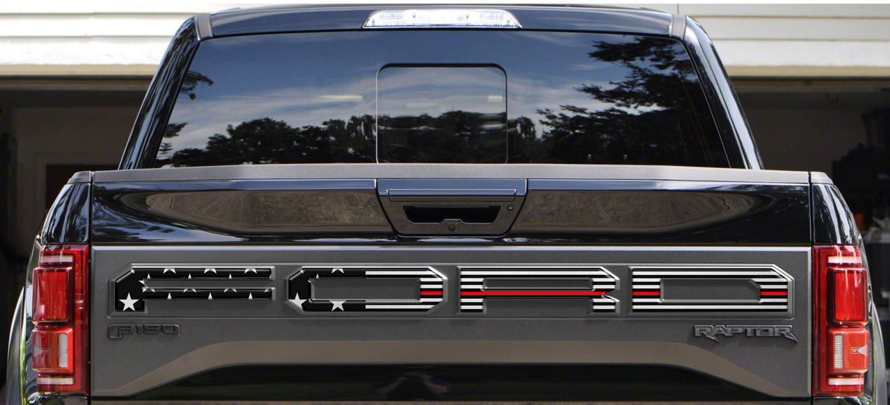 Tailgate Letter Overlays; Black and Silver American Flag with Thin Red Outline (17-18 F-150 Raptor w/ Tailgate Applique)Find parts that fit my vehicle