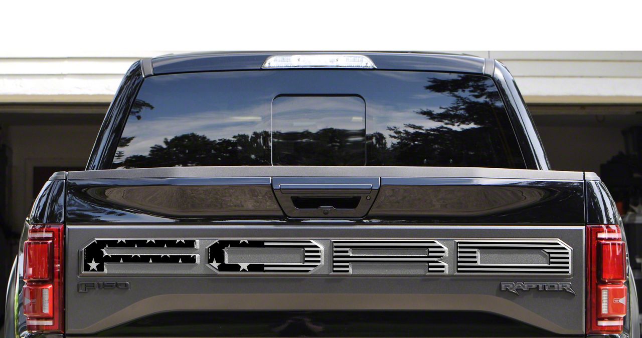 Application. These Tailgate Insert Letters; Black and Silver American Flag Design are designed to fit 2017-2018 Ford F-150 Raptor models with tailgate applique.