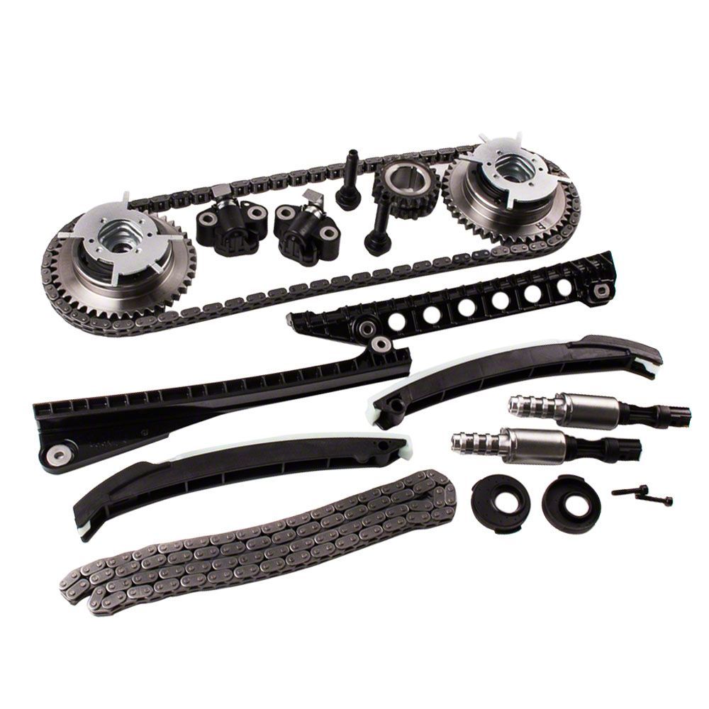 Construction and Appearance. Built from premium materials, each component in the kit is crafted for strength and precision. The timing chains are constructed from heavy-duty steel for long-lasting performance under high-stress conditions, while the tensioners and guides feature a combination of raw metal and matte black finishes for superior wear resistance and durability. The cam phasers, sprockets, and solenoid valves are engineered to meet or exceed OEM tolerances, ensuring reliable oil flow control and accurate timing adjustments. This design guarantees consistent performance, reduced noise, and dependable engine operation for years to come.