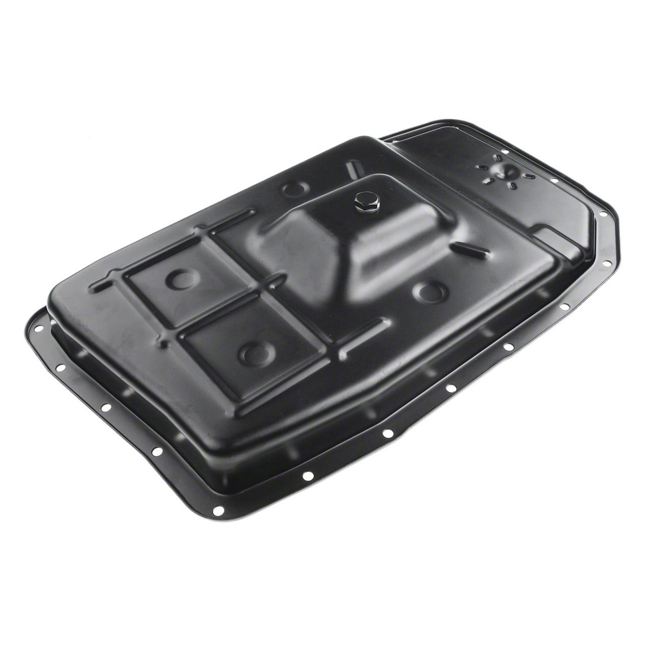 Construction and Design. Formed from durable steel, the oil pan features a matte black finish for corrosion resistance and a clean, OE-style appearance. A 13-quart capacity and 2.8-inch depth are engineered to match transmission requirements, while the 21-bolt-hole layout ensures secure, even sealing across the mounting surface.