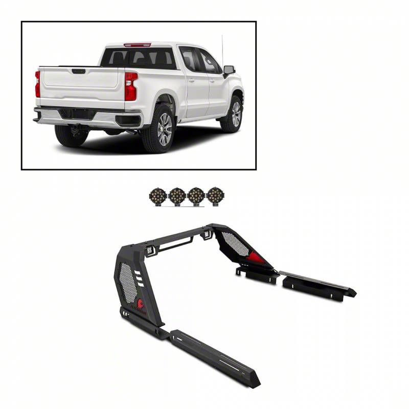 Robust Utility and Lighting. The Roll Bar designed for F-150 Styleside models enhances both the functionality and aesthetic of the vehicle. This addition not only provides structural reinforcement but also includes two 7-inch black round LED lights for improved visibility during nighttime driving or work conditions. The roll bar extends along the bed rails, offering additional tie-down points that increase the utility for cargo management, making it a valuable upgrade for both practical use and visual appeal.