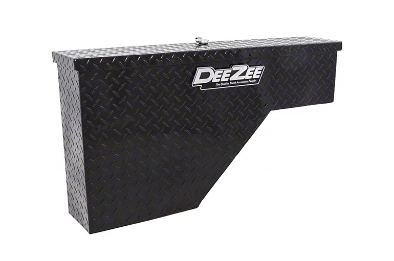 Convenient Added Storage Space. The Gloss Black Wheel Well Tool Box is designed specifically for passenger-side placement. This innovative toolbox offers an extra storage location, conveniently utilizing the space within the wheel well. The lockable lift-up lid ensures the safety and security of your tools and belongings. Built with a sturdy piano hinge, this toolbox guarantees durability and long-lasting performance.
