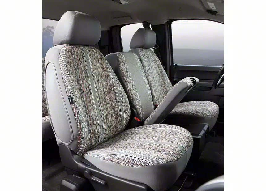 If you are looking for a rugged seat cover that will bring an authentic Western aesthetic to your vehicle, then check out the Fia Wrangler Seat Covers! They are constructed from authentic woven saddle blanket fabric with classic Western styling. Saddle blanket has been around for centuries and is known for being extremely rugged and durable. These seat covers are wear resistant making them the perfect option for heavy industrial use or work trucks. They are perfect for any weather condition as they stay warm in the winter and cool in the summer. They come in black, brown, and grey as well as navy and wine (on select applications).
