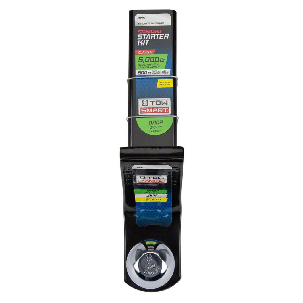 The Class III, 5,000 lb. Standard Mount Starter Kit has the towing essentials to get you started hauling and on the road. It includes a 2 in. ball, a 5/8 in. standard pin, and a 3-1/4 in. Drop x 2 in. Rise Ball Mount. The ball mount is ideal for towing trailers and is used with full-size pickup trucks, SUVs, flatbeds and other commercial vehicles. The trailer hitch ball mount’s hollow steel design provides the ultimate strength and can be used in either the drop or rise position for towing applications depending on your requirement. Make sure to know the total weight of the trailer (GTW) you are towing and the maximum towing capacity determined by your vehicle manufacturer to select the correct Class. Made of durable, heavy-duty steel construction with a black powder coat finish that is corrosion-resistant to withstand extreme weather.