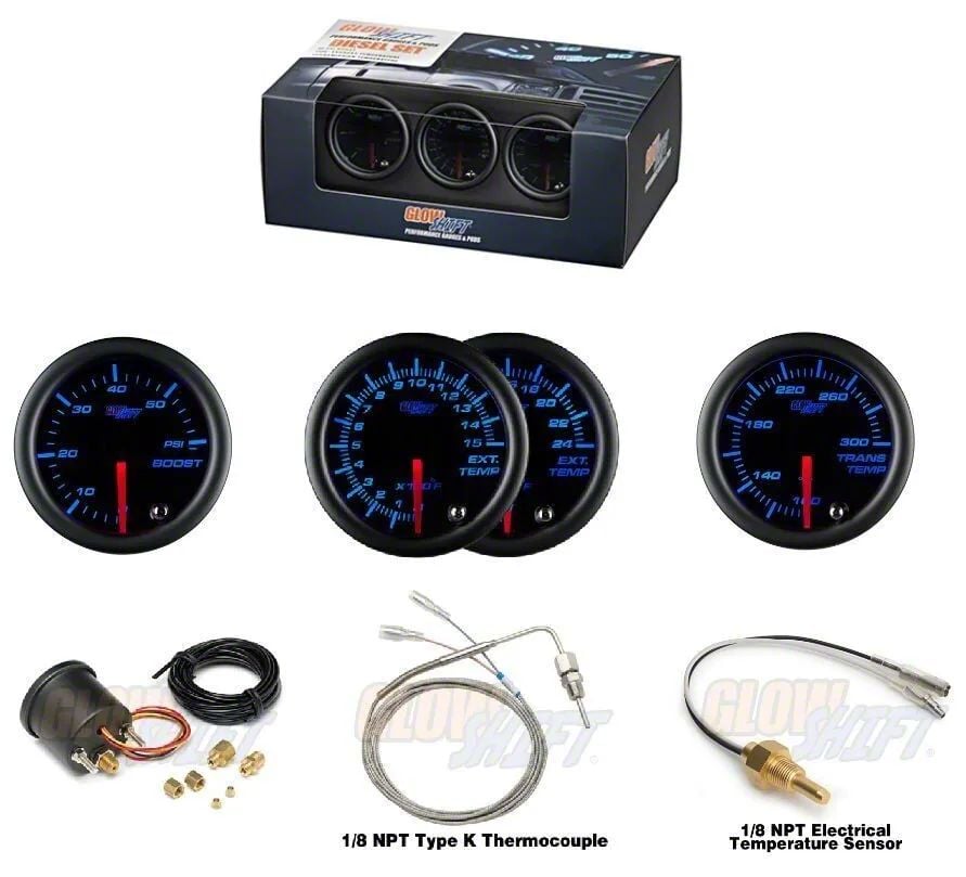 Diesel Truck Gauge Set. The 3-Gauge Diesel Truck Set is designed to provide critical data for high-performance diesel trucks, especially when towing heavy loads or traveling long distances. This set includes a 60 PSI boost gauge, a pyrometer EGT gauge reading up to 2400 degrees, and a transmission temperature gauge for monitoring your truck’s key metrics.