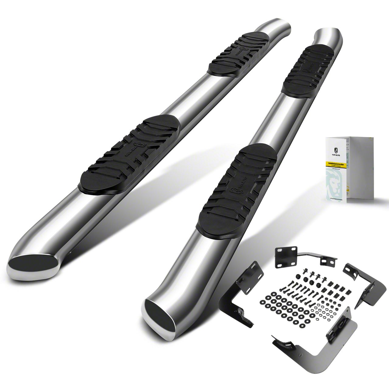 Construction and Appearance. Constructed from high-quality 304 stainless steel, these side step bars are built for strength and longevity. They feature a sleek chrome finish that not only adds to the durability but also provides a stylish appearance that complements the vehicle's overall look.
